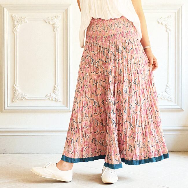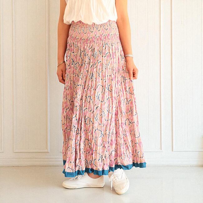 ★インドのブロックプリント生地をたっぷり使ったクリンクルコットンロングスカート。