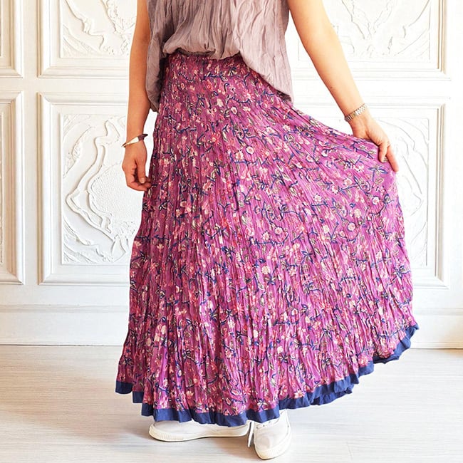 ★インドのブロックプリント生地をたっぷり使ったクリンクルコットンロングスカート。