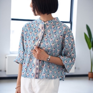 ブロックプリントコットンゆったりスリーブシャツ【ブルー】