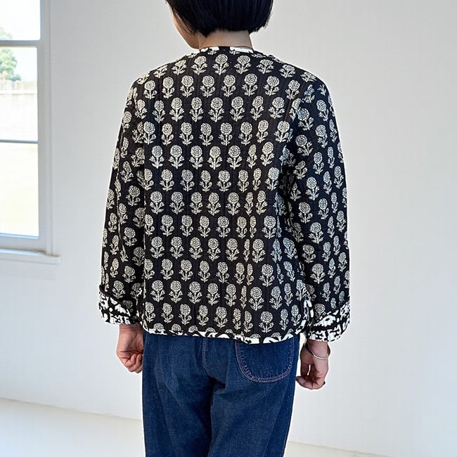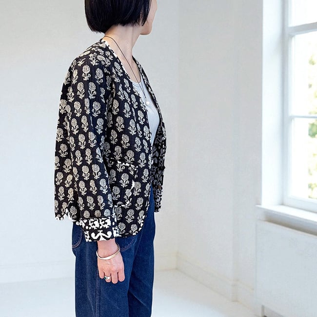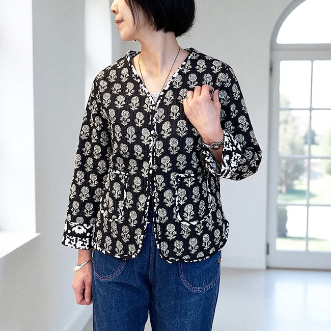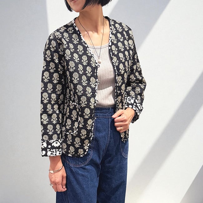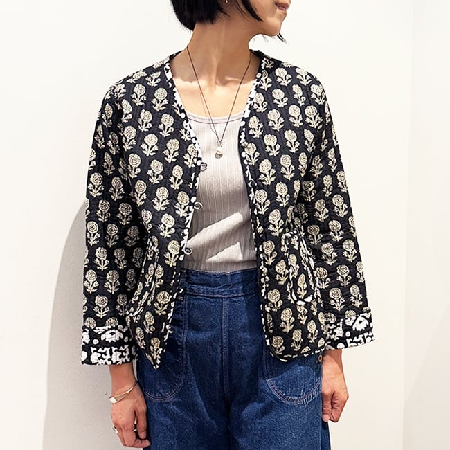 ★温かみのある ハンドブロックプリント生地を使用したキルティングジャケット。