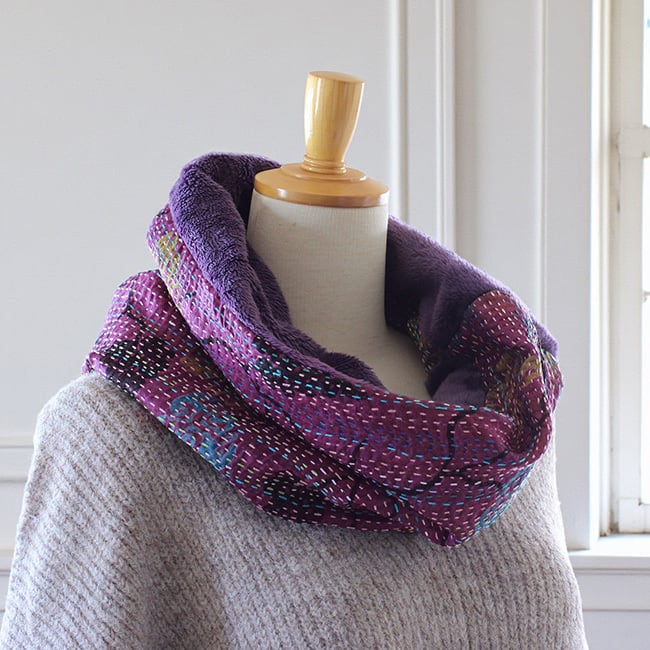 ★インドのカンタ刺繍(刺し子)シルクとエコファーで作ったねじりスヌード。