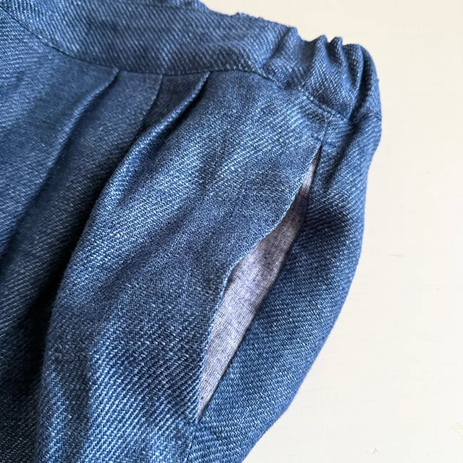 フロントにタックを入れ、背面のみゴムを入れています。
