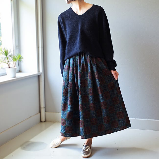 刺し子シルクカンタギャザースカート【ブラックB】