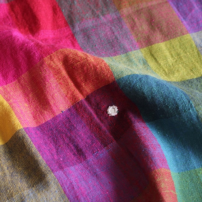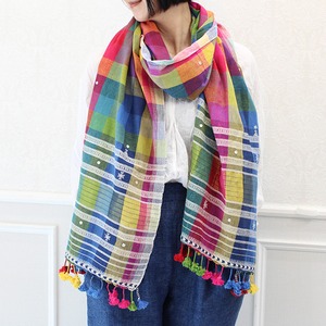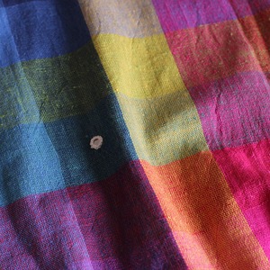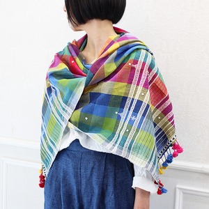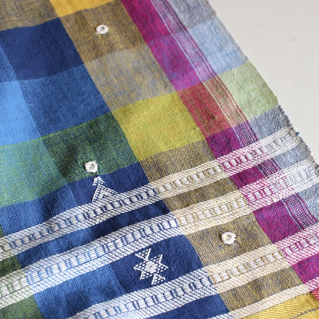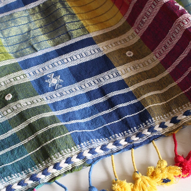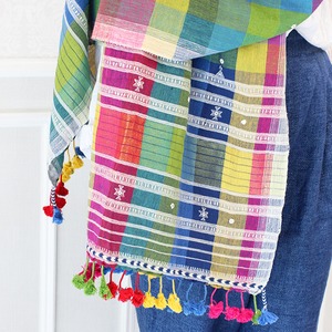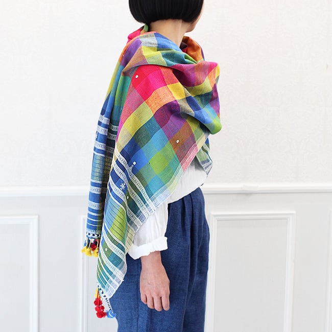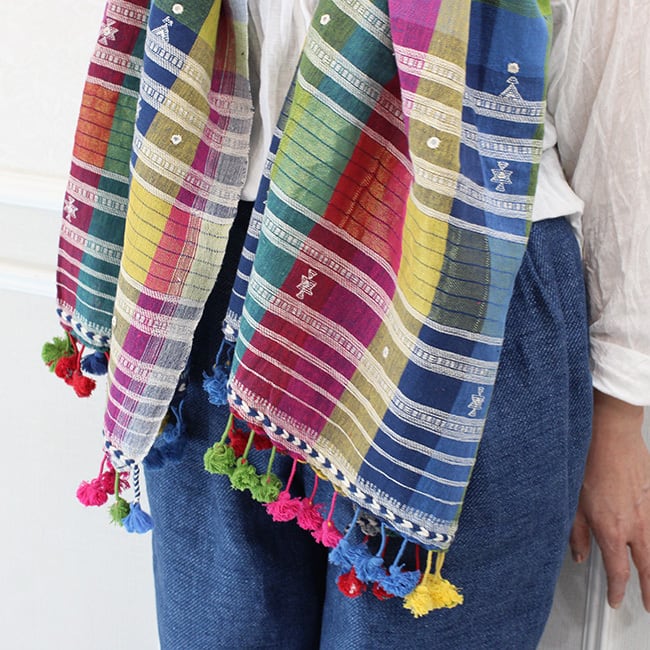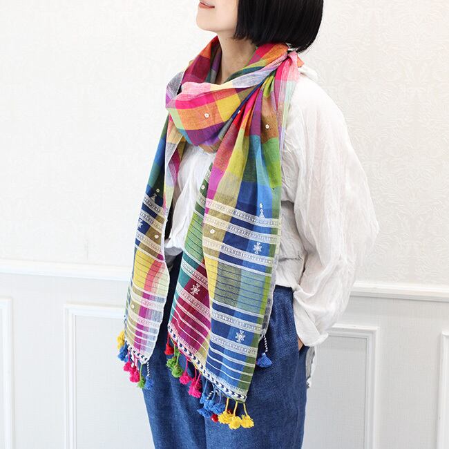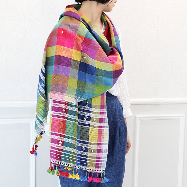 存在感抜群のカラフルなチェックにミラーワーク、カッチ特有の織り柄や、裾のタッセルが映えるシンプルながらも洗練されたデザイン。