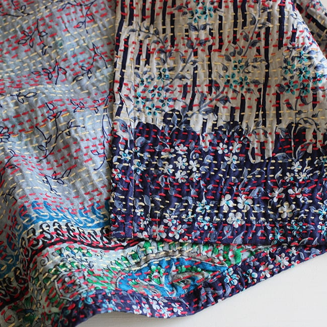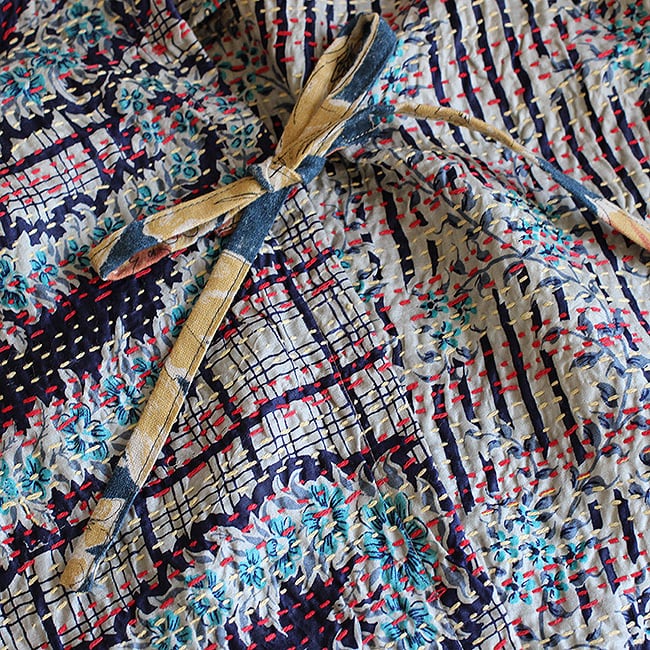 使い込んだシルクのサリーを重ね合わせて、チクチクと一針ずつ刺し子を施しています。