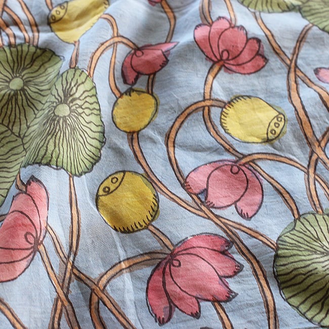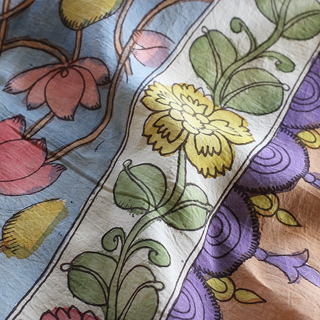 スリカラハスティ・カラムカリは木版プリントではなく、職人が一本のペンで丁寧に描き上げた手描きならではの繊細な線と表情が魅力です。