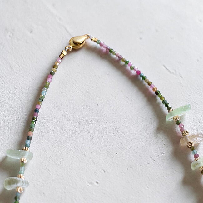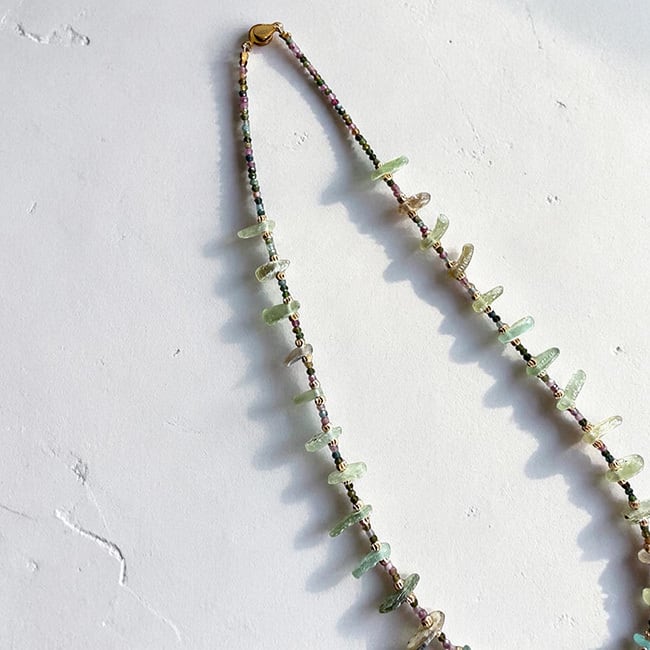 ローマングラスと小さなトルマリンビーズを組み合わせた動きのあるデザインです。