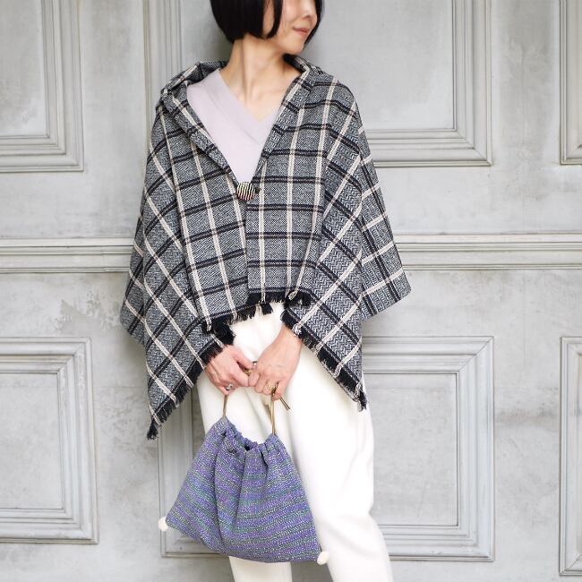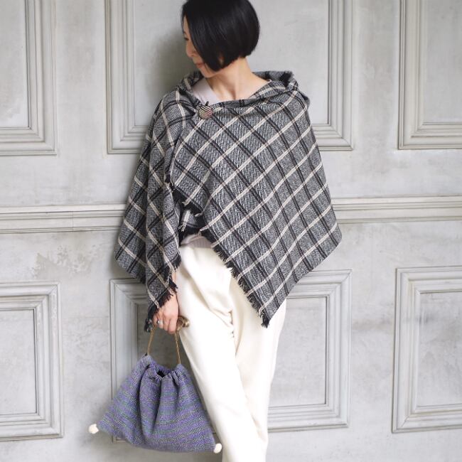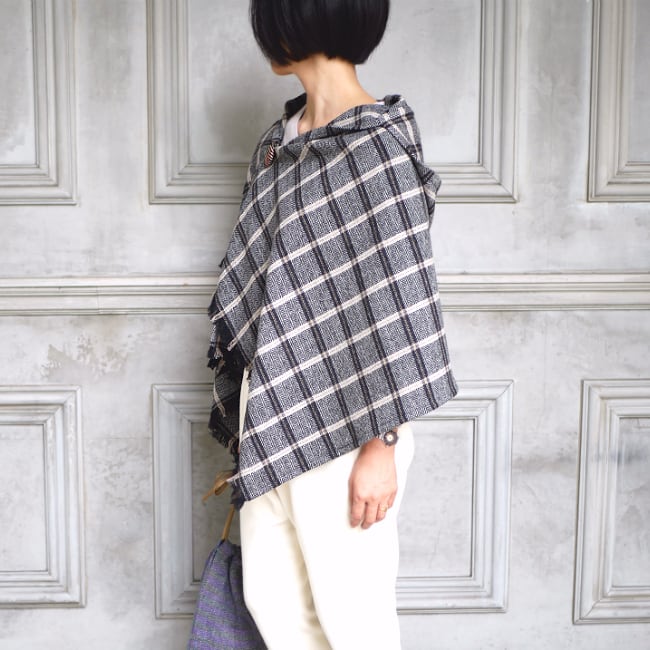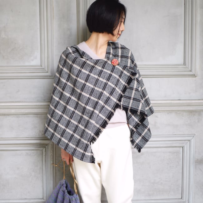 選べる刺繍ブローチ付きウールストールポンチョ【ヘリンボーンチェック】