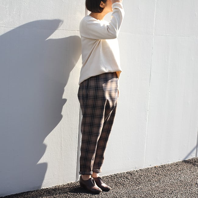 何度も生地違いで製作している定番のテーパードラップサルエルパンツ。