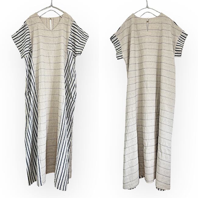 2トーンストライプヘンプコットンワンピース【生成り】