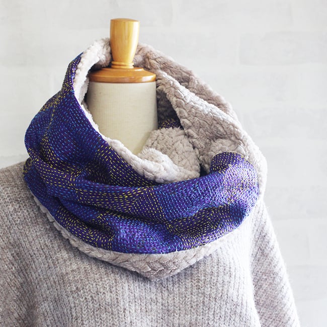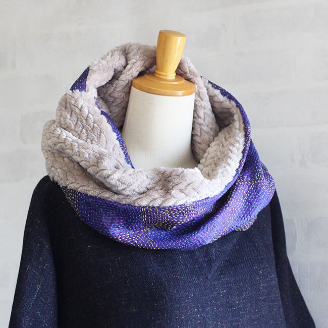 ★インドのカンタ刺繍(刺し子)シルクとあったかいエコファー生地で作ったスヌード。