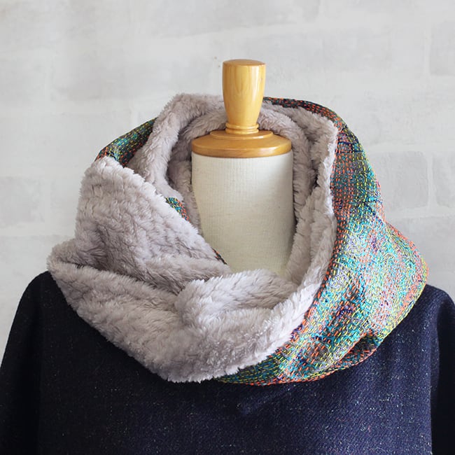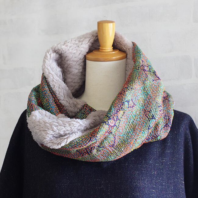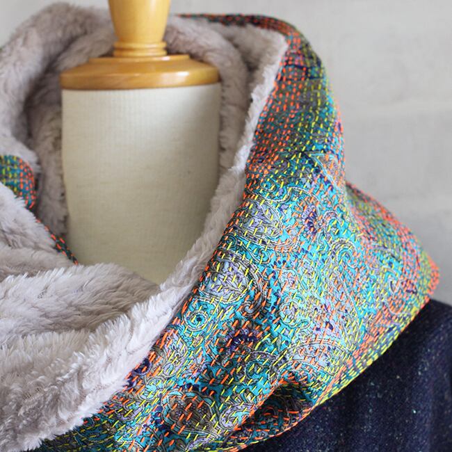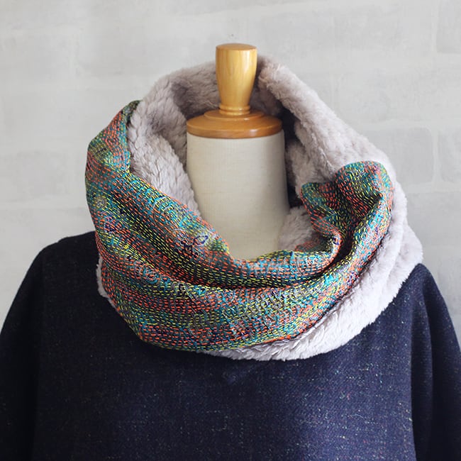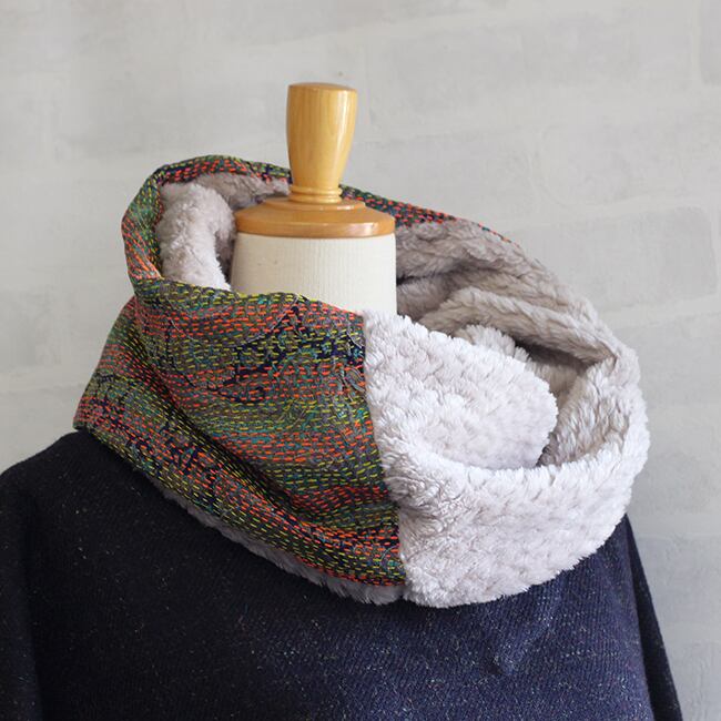 ★インドのカンタ刺繍(刺し子)シルクとあったかいエコファー生地で作ったスヌード。